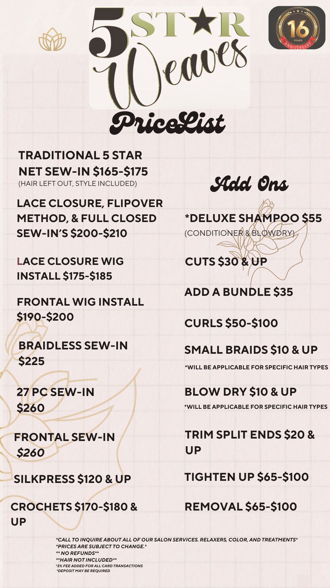 Please let us know when making your appointment if you wish to add our Deluxe Shampoo service. Feel free to bring your own bundles, or you can buy bundles at our hair salon. Check out our bundle options below.